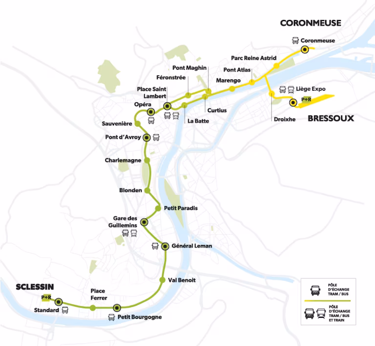 Il est possible de se garer aux parkings relais (P+R) situés aux extrémités de la ligne de tram : Sclessin et Liège Expo. Des tickets combinés parking + trajet en transport sont disponibles aux bornes à chaque arrêt.